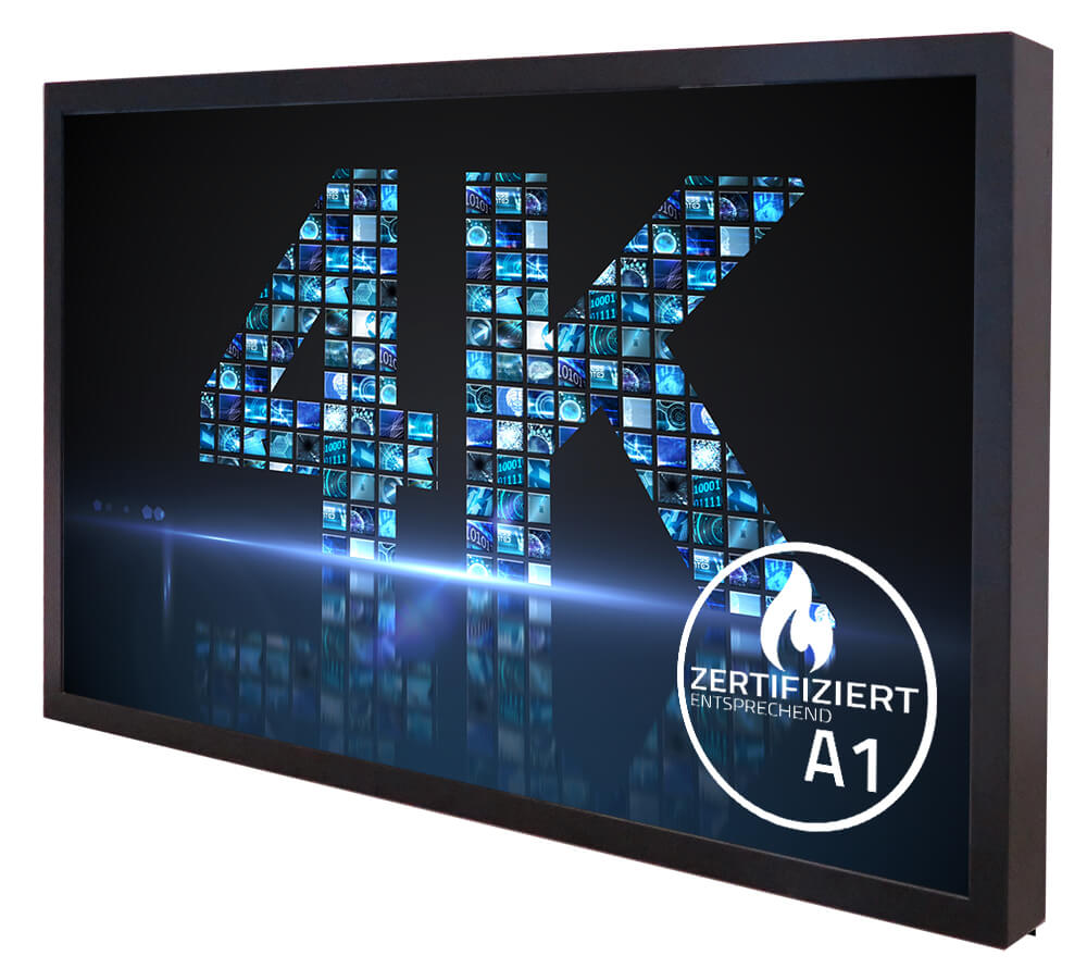 The 64.5" BLO-Line® 4K 64.5 WebPoster M4 monitor is certified in accordance with fire protection class A1 and guarantees maximum safety in the event of a fire. It does not produce any smoke gas in the event of a fire and can be used, for example, in escape routes or other areas with strict fire protection requirements. It is also available as a 10-finger touch monitor.