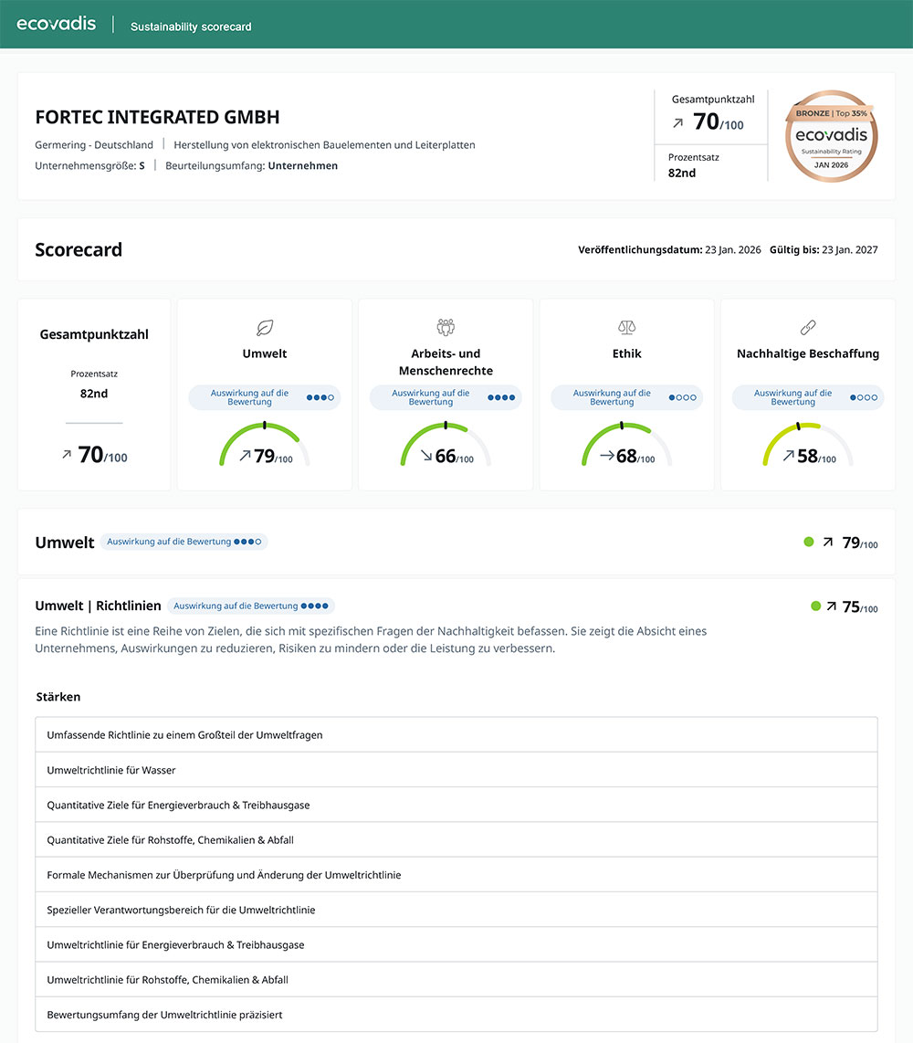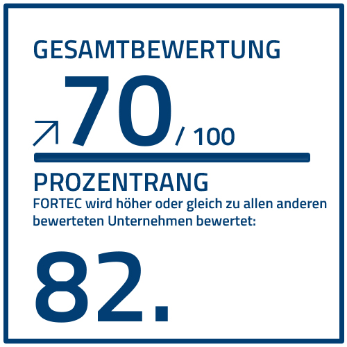 Auch deshalb haben wir uns dem Ranking von EcoVadis gestellt. Seit 2022 sind wir am Hauptsitz in Germering/ München ISO 14001:2015 zertifiziert. 2024 haben wir diese Zertifizierung für die FORTEC Group erreicht. So sorgen wir für unabhängige und für unsere Kunden nachprüfbare Klassifizierungen.